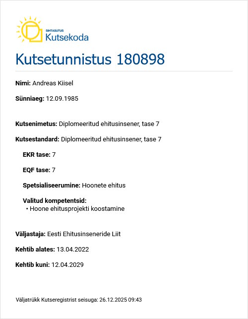 Olen üle 13 aasta tegelenud ehitusprojektide planeerimise ja elluviimisega – alates väiksematest elamutest kuni keerukate rekonstrueerimis- ja uusarendusteni. Keskendun praktilistele ja toimivatele lahendustele, mis toetavad nii arhitekti ideed kui ka ehitaja vajadusi.